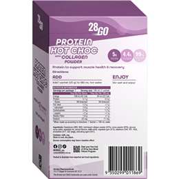 - Bạn đang tìm kiếm một cái ôm trong cốc? Hãy thử Chocolate Hot Protein bổ sung bột collagen của 28GO. Loại sô cô la nóng mịn như nhung này sẽ không chỉ thỏa mãn cơn thèm sô cô la của bạn mà còn tăng cường lượng protein cho bạn, với 5g trong mỗi khẩu phần và 4,4g collagen. Thưởng thức từng ngụm, khi bạn tận hưởng khoảnh khắc tự chăm sóc bản thân sang trọng, đồng thời hỗ trợ sức khỏe và phục hồi cơ bắp của bạn.
