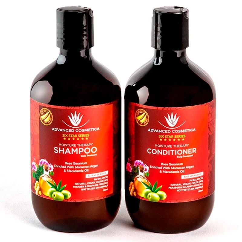 Bộ dầu gội và dầu xả Moisture Therapy của Advanced Cosmetica là giải pháp hoàn toàn tự nhiên tuyệt vời cho tóc khô và hư tổn. Cả hai sản phẩm đều có thành phần chiết xuất từ lô hội kết hợp với tinh dầu hoa phong lữ, Argan Ma-rốc và dầu Macadamia bản địa của Úc để làm sạch, phục hồi và dưỡng ẩm cho tóc. Sự kết hợp độc đáo giữa các thành phần thực vật, tinh dầu, vitamin, khoáng chất và axit amin này giúp giữ ẩm, giúp tóc được gỡ rối, mềm mại và bóng mượt.