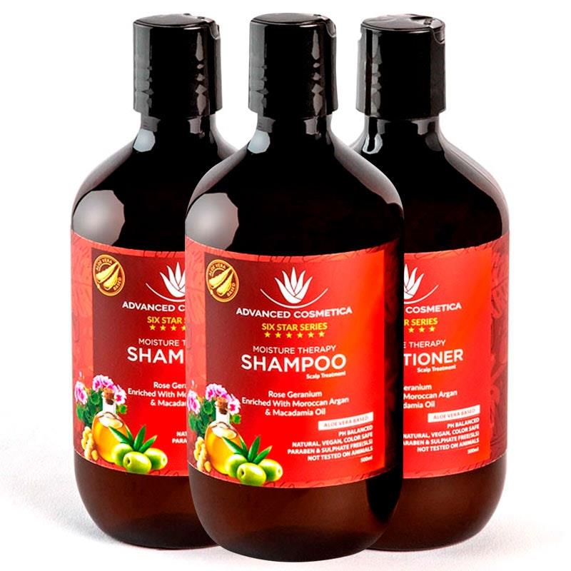 Bộ dầu gội và dầu xả Moisture Therapy của Advanced Cosmetica là giải pháp hoàn toàn tự nhiên tuyệt vời cho tóc khô và hư tổn. Cả hai sản phẩm đều có thành phần chiết xuất từ lô hội kết hợp với tinh dầu hoa phong lữ, Argan Ma-rốc và dầu Macadamia bản địa của Úc để làm sạch, phục hồi và dưỡng ẩm cho tóc. Sự kết hợp độc đáo giữa các thành phần thực vật, tinh dầu, vitamin, khoáng chất và axit amin này giúp giữ ẩm, giúp tóc được gỡ rối, mềm mại và bóng mượt.