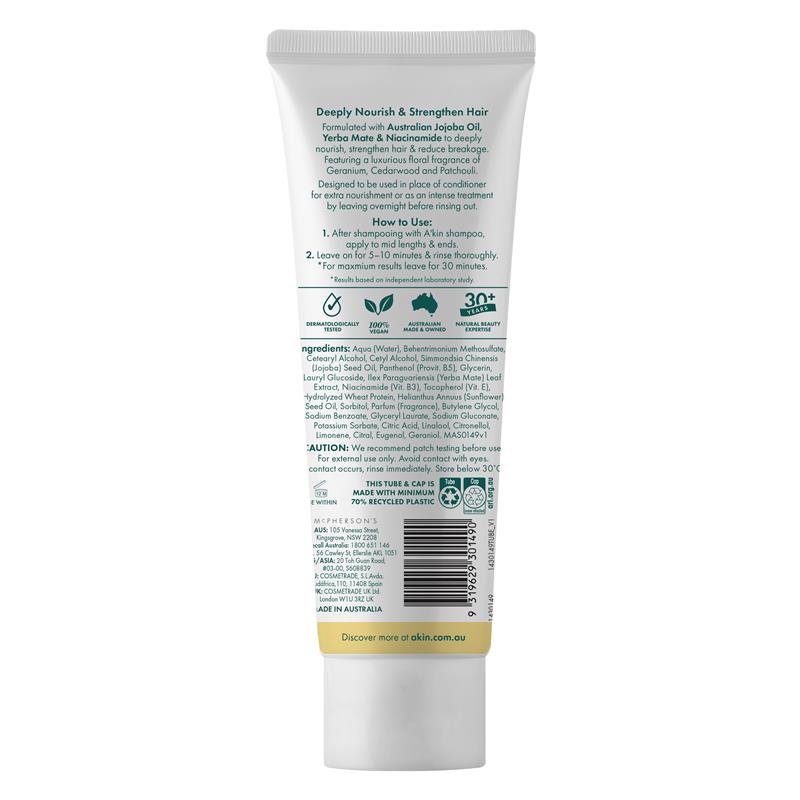 Được pha chế với Dầu Jojoba của Úc, Yerba Mate & Niacinamide để nuôi dưỡng sâu, làm chắc tóc & giảm gãy rụng. Được thiết kế để sử dụng thay cho dầu xả để nuôi dưỡng thêm hoặc như một liệu pháp chuyên sâu bằng cách để qua đêm trước khi xả sạch.Đã được kiểm nghiệm da liễu & phù hợp với mọi loại da.