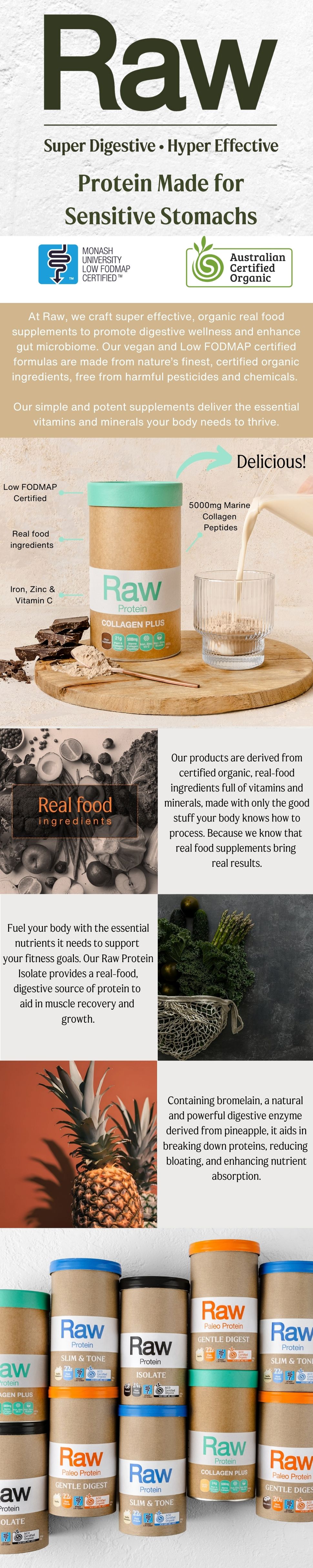 Amazonia Raw Protein Collagen Plus là hỗn hợp cao cấp của Marine Collagen và protein thực vật nảy mầm và lên men hữu cơ để hỗ trợ sản xuất collagen và cấu trúc mô liên kết. Công thức này chứa 5000mg Peptide Collagen thủy phân loại I & III có khả năng sinh học cao và enzyme tiêu hóa có nguồn gốc thực vật để hỗ trợ hấp thụ dễ dàng. Với Vitamin C hữu cơ toàn thực phẩm để hỗ trợ sản xuất collagen và Kẽm để hỗ trợ tóc, da và móng, đây là protein làm đẹp tuyệt vời Thực phẩm bổ sung thực phẩm siêu tiêu hóa, siêu hiệu quảYêu cầu về sản phẩm: Được chứng nhận FODMAP thấp, không chứa gluten, không chứa đậu nành, không chứa GMO, không chứa chất tổng hợp, peptide collagen biển