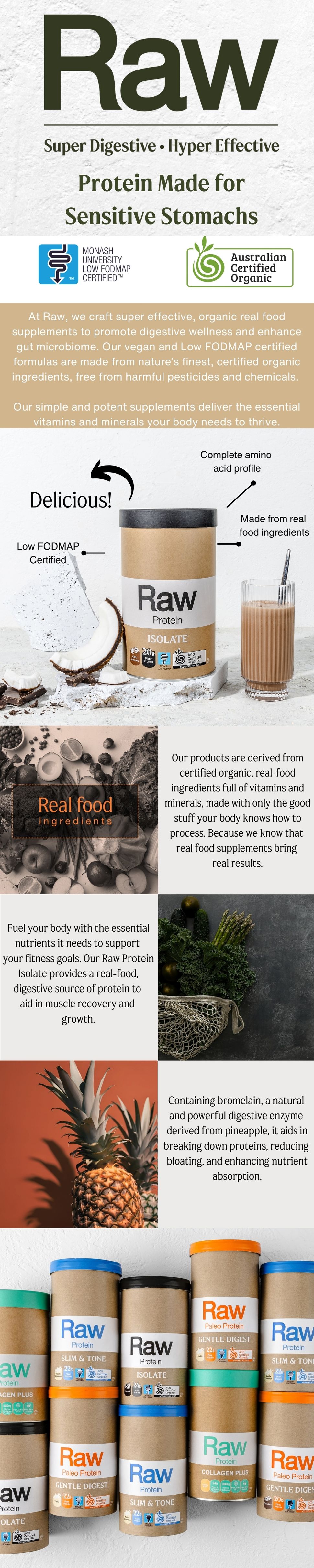 Amazonia Raw Protein Isolate là công thức mịn ngon được thiết kế để hỗ trợ lượng protein hấp thụ hàng ngày, tăng trưởng cơ nạc và phục hồi mô. Sản phẩm chứa hỗn hợp Protein đậu vàng nảy mầm và lên men hữu cơ được chứng nhận và gạo lứt. Là nguồn cung cấp sắt, phốt pho và kẽm, Raw Protein Isolate cung cấp hồ sơ axit amin hoàn chỉnh và chứa enzyme tiêu hóa thực vật Bromelain giúp tiêu hóa dễ dàng. Thực phẩm bổ sung thực phẩm thật siêu tiêu hóa, siêu hiệu quảYêu cầu về sản phẩm: Được chứng nhận hữu cơ, được chứng nhận FODMAP thấp, không chứa gluten, không chứa đậu nành, không chứa GMO, không chứa chất tổng hợp