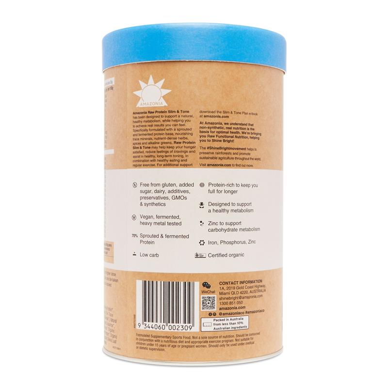 Amazonia Raw Protein Slim & Tone là công thức protein ít carb được thiết kế để hỗ trợ quá trình trao đổi chất lành mạnh, kiềm chế cơn thèm ăn và tăng cảm giác no. Hỗn hợp này bao gồm protein thực vật nảy mầm và lên men, khoáng chất vi lượng, thảo mộc giàu dinh dưỡng, gia vị và rau xanh kiềm, giúp sản phẩm trở thành lựa chọn bổ dưỡng. Sản phẩm này nhằm mục đích giúp kiểm soát cơn đói và hỗ trợ săn chắc cơ thể lâu dài khi kết hợp với chế độ ăn uống cân bằng và tập thể dục thường xuyên