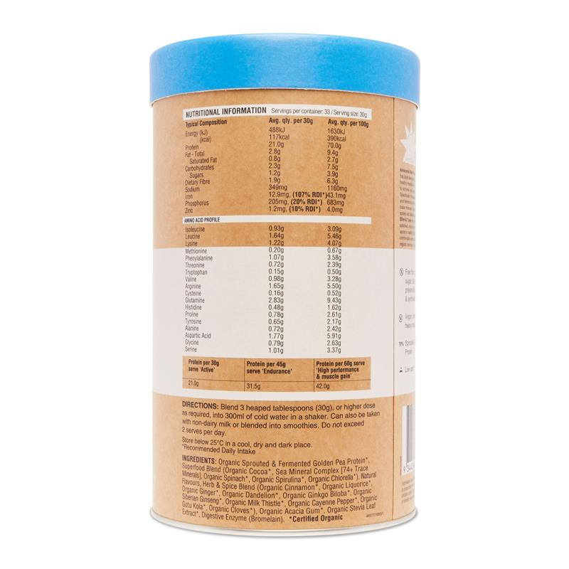 Thành phần hoạt tính: Protein đậu vàng nảy mầm và lên men hữu cơ, hỗn hợp siêu thực phẩm (ca cao hữu cơ, phức hợp khoáng chất biển, rau bina hữu cơ, tảo xoắn hữu cơ, tảo lục hữu cơ), hỗn hợp thảo mộc và gia vị (quế hữu cơ, cam thảo hữu cơ, gừng hữu cơ, bồ công anh hữu cơ, bạch quả hữu cơ, nhân sâm Siberia hữu cơ, kế sữa hữu cơ, ớt cayenne hữu cơ, rau má hữu cơ, đinh hương hữu cơ), kẹo cao su Acacia hữu cơ, enzyme tiêu hóa (Bromelain)