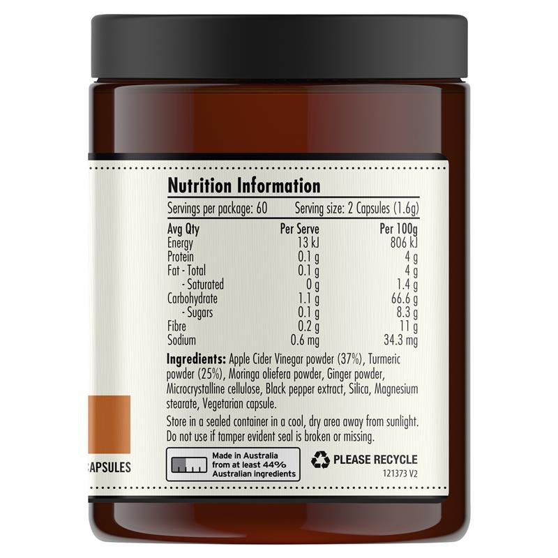 Bột giấm táo (37%), Bột nghệ (25%), Bột Moringa oliefera, Bột gừng, Cellulose vi tinh thể, Chiết xuất hạt tiêu đen, Silica, Magnesi stearat, Viên nang chay.
