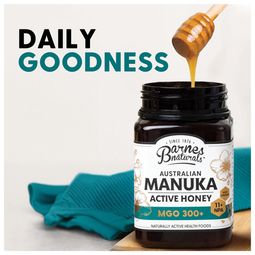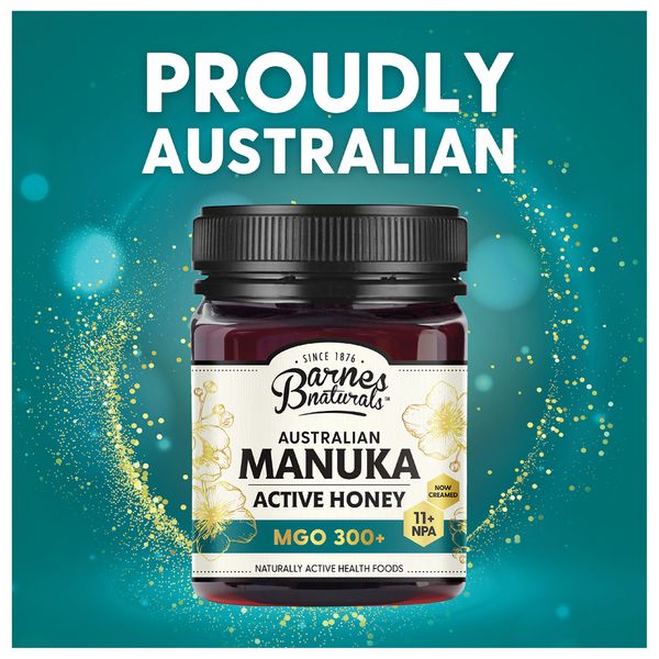 Thưởng thức hương vị ngọt ngào, mịn màng và kết cấu kem của mật ong Manuka Barnes Naturals. Mật ong Manuka Úc MGO 300+ nguyên chất 100% của chúng tôi là sự lựa chọn đa năng cho cả gia đình - hoàn hảo khi dùng theo thìa, trên bánh mì nướng, trong trà hoặc với ngũ cốc, và cũng thích hợp cho các biện pháp khắc phục tại nhà và chăm sóc da tự nhiên.