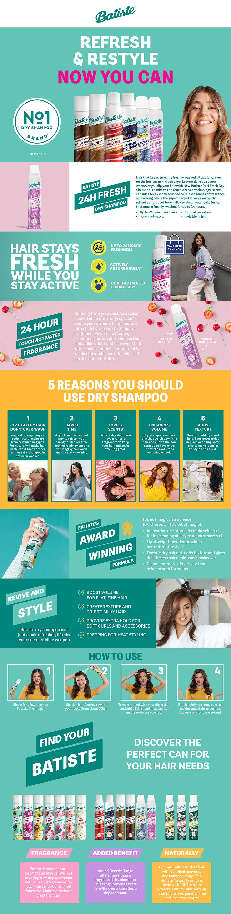 Dầu gội khô Batiste 24H Fresh sử dụng Công nghệ kích hoạt cảm ứng để giữ cho tóc trông và có mùi thơm tươi mát lên đến 24 giờ.