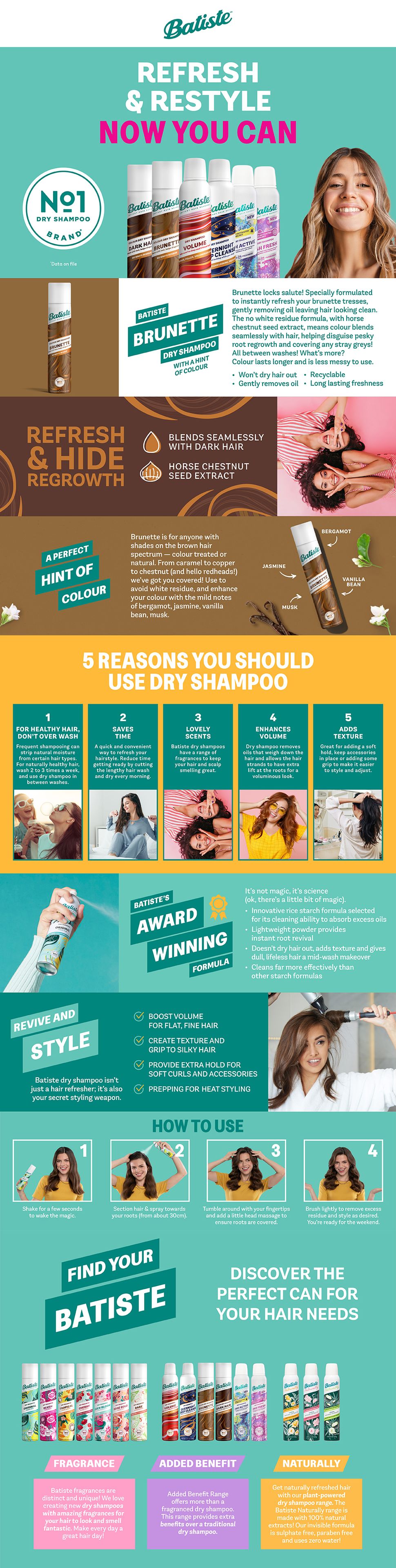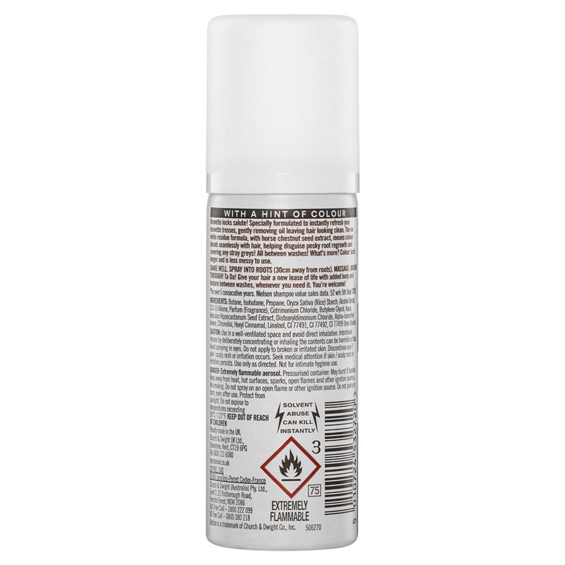 Dầu gội khô nhuộm màu Batiste dành cho tóc nâu hòa quyện với tóc và giúp che đi phần chân tóc. Không có cặn trắng.