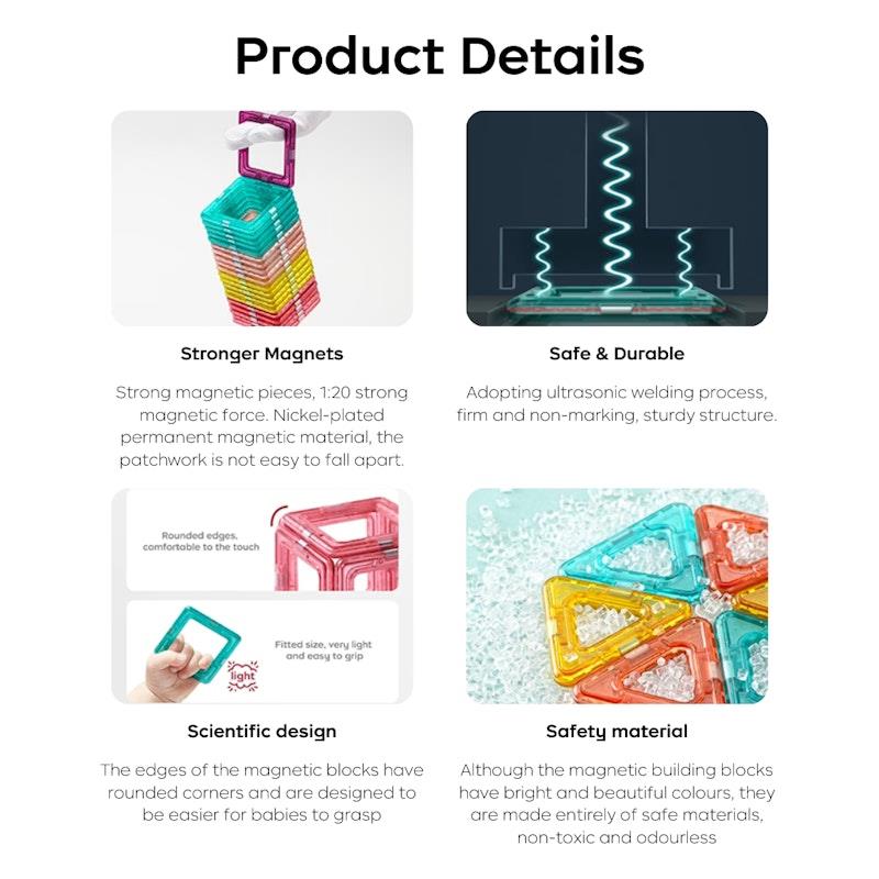 ?Kích thích sự sáng tạo? Khối xây dựng từ tính trong suốt đầy màu sắc này có 32 mảnh bao gồm nhiều màu sắc. Nó có thể nuôi dưỡng sự sáng tạo của bé. Hãy để bé tự do xây dựng lâu đài, tàu vũ trụ, khủng long hoặc bướm. Đây là một món đồ chơi giáo dục tuyệt vời. ?An toàn & Bền bỉ? Đồ chơi xây dựng từ tính của chúng tôi được làm bằng vật liệu không độc hại, không mùi và an toàn và được hàn siêu âm. Nó chống rơi tốt hơn, ngăn đồ chơi bị vỡ và loại bỏ nguy cơ trẻ em vô tình ăn phải nam châm. Sự an toàn của bé luôn là ưu tiên hàng đầu của chúng tôi. ?Từ tính siêu mạnh? Các khối xây dựng từ tính của chúng tôi được làm bằng lõi từ tính siêu mạnh có thể dễ dàng nhặt tới 20 mảnh trong một mảnh duy nhất, vì vậy kiệt tác của bé sẽ được hỗ trợ chắc chắn và không dễ bị vỡ. Bột màu thân thiện với môi trường và an toàn cũng được thêm vào để làm cho màu sắc tươi sáng lấp lánh và giúp bé tập trung. ?Giáo dục toàn diện? Thích hợp cho trẻ từ ba tuổi trở lên, khối xây dựng từ tính này sẽ mang đến cho trẻ một nền giáo dục toàn diện trong khi chơi. Trò chơi khối đầy màu sắc giúp tăng cường khả năng sáng tạo của trẻ và kích thích trí tưởng tượng. Giúp trẻ phối hợp tay mắt. Cải thiện kỹ năng thị giác không gian, phù hợp với sự tập trung, thúc đẩy sự phát triển nhận thức và ngôn ngữ, đồng thời khuyến khích sự hợp tác và phân công lao động. ?Món quà hoàn hảo?Các khối xây dựng từ tính mang đến trải nghiệm vui chơi thú vị cho gia đình, bạn bè và trẻ em để dành thời gian chất lượng bên nhau trong khi sử dụng sự sáng tạo và trí tưởng tượng của mình. Cho dù là quà tặng cho bạn bè hay trẻ em, các khối xây dựng từ tính chắc chắn sẽ là món quà bất ngờ cho bất kỳ ngày lễ hoặc dịp nào, chẳng hạn như sinh nhật, Giáng sinh, Ngày thiếu nhi, v.v.
