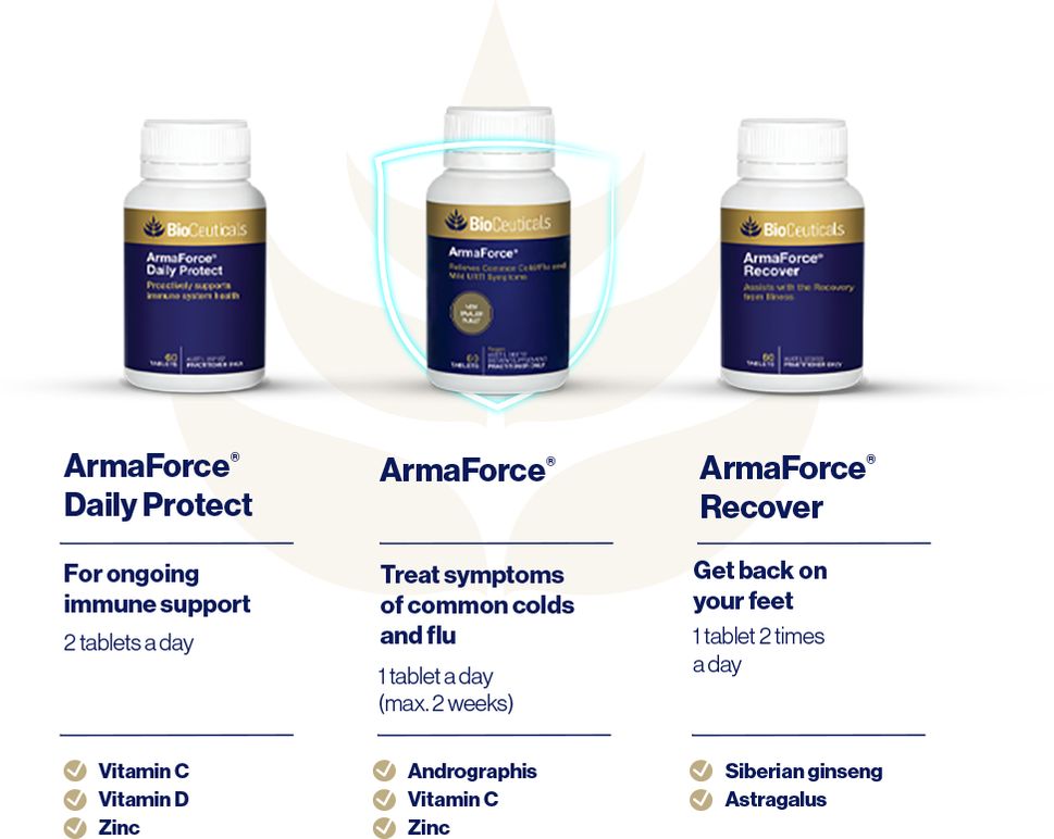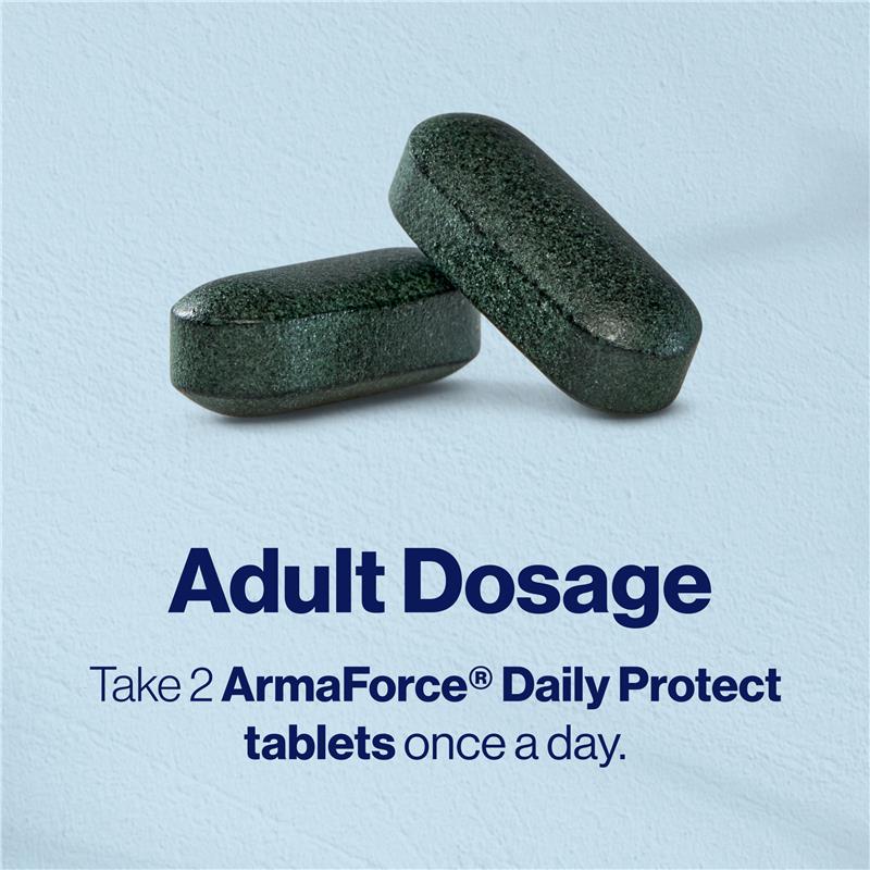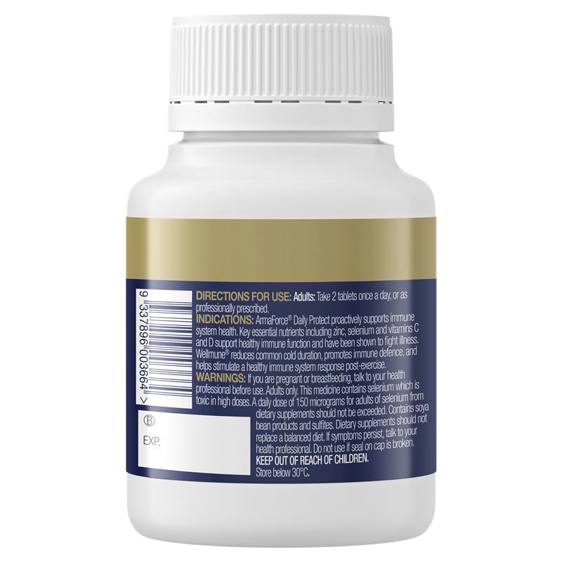 ArmaForce® Daily Protect có Wellmune®. Sản phẩm đã được chứng minh là có thể rút ngắn thời gian bị cảm lạnh thông thường và hỗ trợ hệ thống miễn dịch chống lại bệnh tật sau khi tập thể dục. Sản phẩm cũng chứa các chất dinh dưỡng chống oxy hóa như selen, kẽm và vitamin C giúp giảm các gốc tự do hình thành trong cơ thể. Vitamin C, D, kẽm và selen hỗ trợ chức năng hệ thống miễn dịch khỏe mạnh và giúp hệ thống miễn dịch chống lại bệnh tật, trong khi vitamin C, D và kẽm giúp kích thích phản ứng của hệ thống miễn dịch khỏe mạnh.Phù hợp cho: Chỉ dành cho người lớn