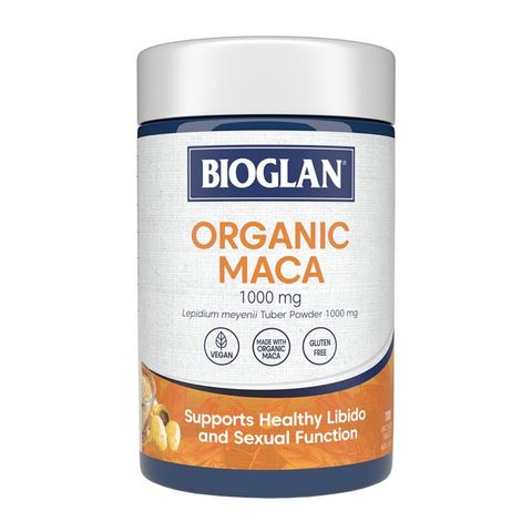 Viên nén Bioglan Organic Maca 1000mg được làm từ bột maca, có nguồn gốc tự nhiên dành cho những người muốn hỗ trợ ham muốn tình dục lành mạnh.