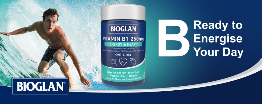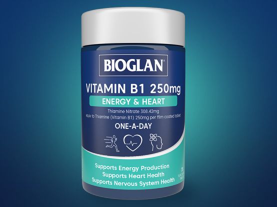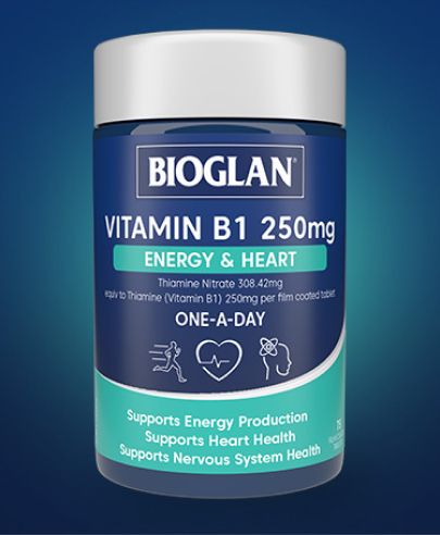 Bioglan Vitamin B1 250 mg là công thức tiện lợi, một viên mỗi ngày để hỗ trợ năng lượng và tim. Sản phẩm này chứa Thiamine (Vitamin B1), cung cấp năng lượng cho mọi tế bào trong cơ thể và giúp hỗ trợ sản xuất năng lượng, sức khỏe tim mạch và chức năng hệ thần kinh.
