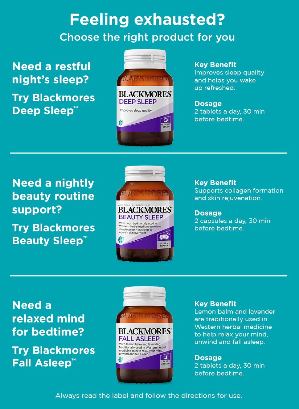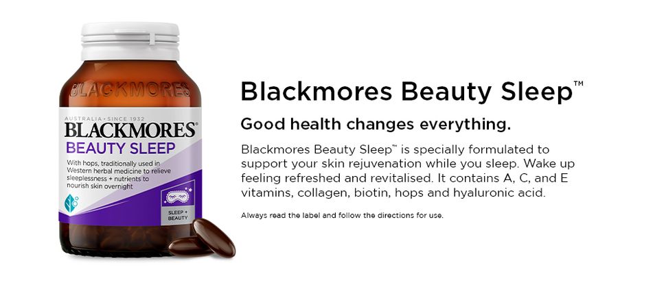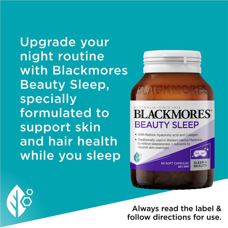 Blackmores Beauty Sleep chứa Hops theo truyền thống được sử dụng trong y học thảo dược phương Tây để hỗ trợ giấc ngủ lành mạnh cùng với Retinol, Hyaluronic Acid, Collagen và Vitamin C để nuôi dưỡng làn da qua đêm. Người lớn uống 2 viên nang một lần một ngày trước khi đi ngủ 30 phút. Sử dụng ngắn hạn tối đa 3 tháng