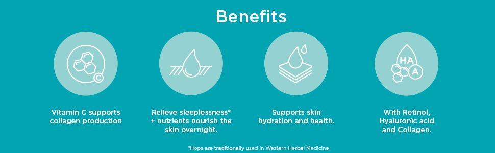• Với Retinol, Vitamin C,*axit hyaluronic và Collagen.• Theo truyền thống được sử dụng trong Y học thảo dược phương Tây để giảm chứng mất ngủ. Nuôi dưỡng làn da qua đêm.