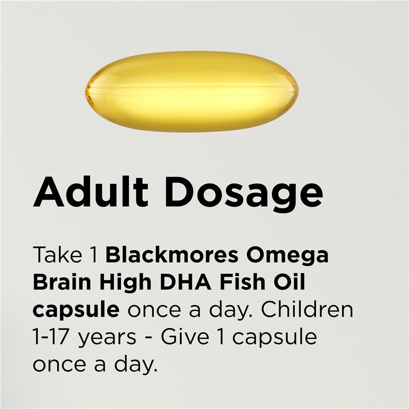 Giúp hỗ trợ chức năng nhận thức với Dầu cá Blackmores Omega Brain High DHA. Mỗi viên nang cung cấp lượng DHA gấp bốn lần so với viên nang dầu cá tiêu chuẩn 1000 viên của chúng tôi.* Dầu cá Blackmores được chiết xuất từ 100% cá đánh bắt tự nhiên. Quy trình chiết xuất đảm bảo dầu tinh khiết, chất lượng cao đã được kiểm tra về thủy ngân, dioxin và PCB. Dầu cá cô đặc, chất lượng cao này cung cấp 500 mg DHA cho mỗi viên nang, vì vậy chỉ cần uống 1 viên nang một lần mỗi ngày để giúp hỗ trợ sức khỏe não bộ và chức năng tinh thần. *Mỗi viên nang dầu cá tiêu chuẩn Blackmores 1000 chứa 300 mg triglyceride biển omega-3, bao gồm 180 mg Axit Eicosapentaenoic (EPA) và 120 mg Axit Docosahexaenoic (DHA) (Tổng EPA + DHA = 300 mg).