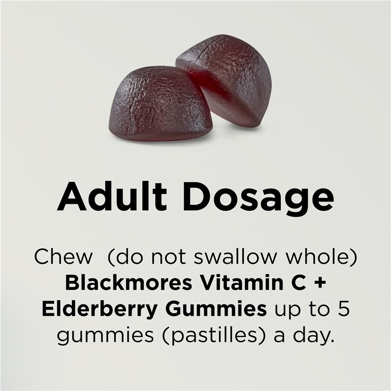 Giảm cảm lạnh thông thường với Blackmores Vitamin C + Elderberry Gummies. Những viên kẹo dẻo elderberry có hương vị tuyệt vời này cung cấp cho cơ thể bạn một liều vitamin C hàng ngày. Sản phẩm này hỗ trợ hệ thống miễn dịch của bạn. Tuyệt vời nhất là nó không chứa 99% đường. Trẻ em 2-4 tuổi - Nhai (không nuốt toàn bộ) 1 viên kẹo dẻo (pastille) một lần một ngày. Trẻ em 5-17 tuổi - Nhai (không nuốt toàn bộ) tối đa 3 viên kẹo dẻo (pastille) một ngày. Người lớn - Nhai (không nuốt toàn bộ) tối đa 5 viên kẹo dẻo (pastille) một ngày.Phù hợp cho: Người lớn và trẻ em trên 2 tuổi