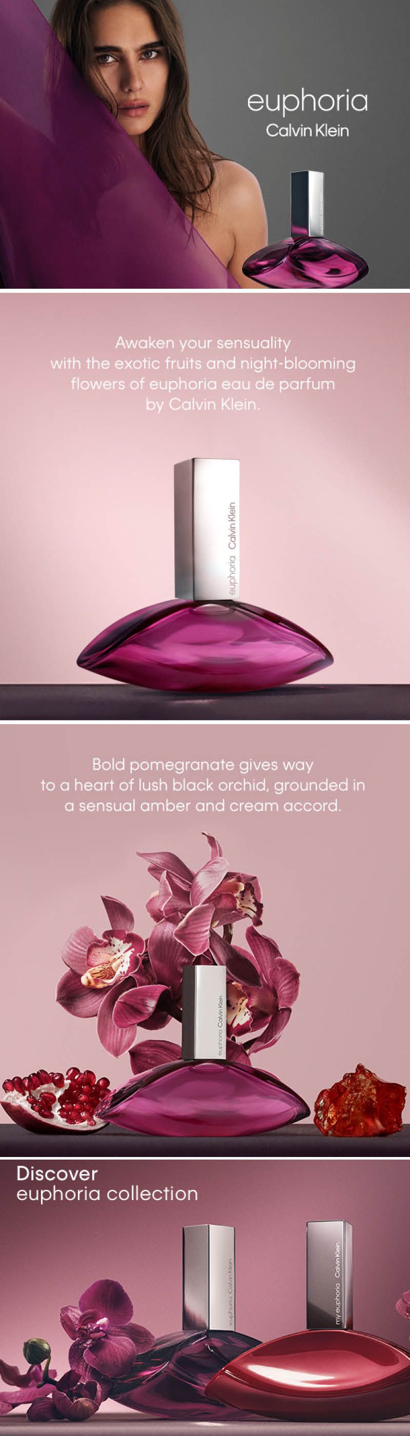 Một loại nước hoa Eau de Parfum nồng nàn và rạng rỡ, Euphoria say đắm với sự bí ẩn của lựu và hoa lan đen, hòa quyện với hổ phách lỏng và gỗ gụ tươi tốt.