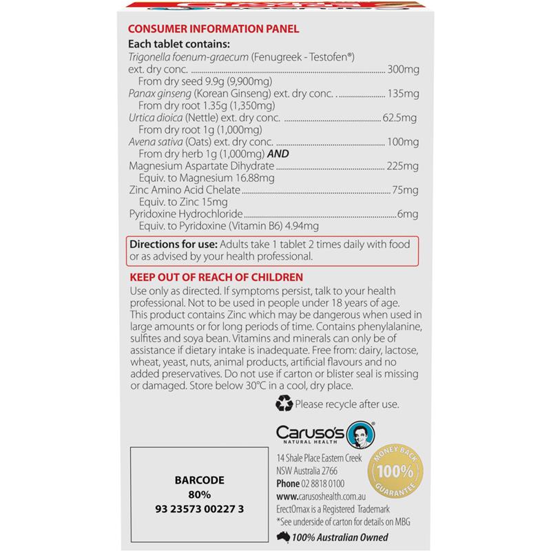 ErectOmax® của Caruso có sự kết hợp đặc biệt của 7 thành phần: Testofen®, Panax Ginseng, Nettle và Oats cùng với Kẽm, Magiê cộng với Vitamin B6 để hỗ trợ sức khỏe nam giới.ErectOmax® của Caruso giúp hỗ trợ mức năng lượng của bạn. ErectOmax® chứa Panax ginseng, một loại thảo dược truyền thống được sử dụng trong Y học Trung Quốc để thúc đẩy mức năng lượng. ErectOmax® của Caruso cũng chứa Vitamin B6 để hỗ trợ mức năng lượng ở nam giới khỏe mạnh. ErectOmax® của