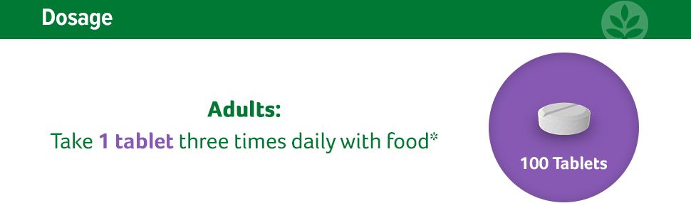Người lớn: Uống 1 viên ba lần mỗi ngày cùng thức ăn hoặc theo khuyến nghị của chuyên gia chăm sóc sức khỏe.