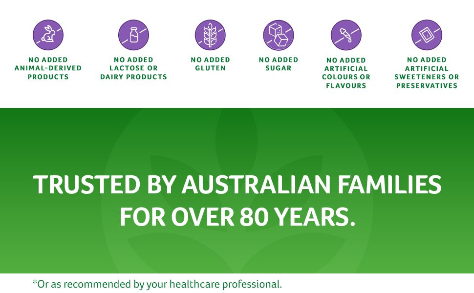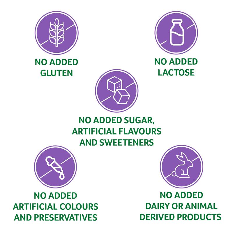 Không chứa: Gluten, Lactose, Đường, Màu nhân tạo,