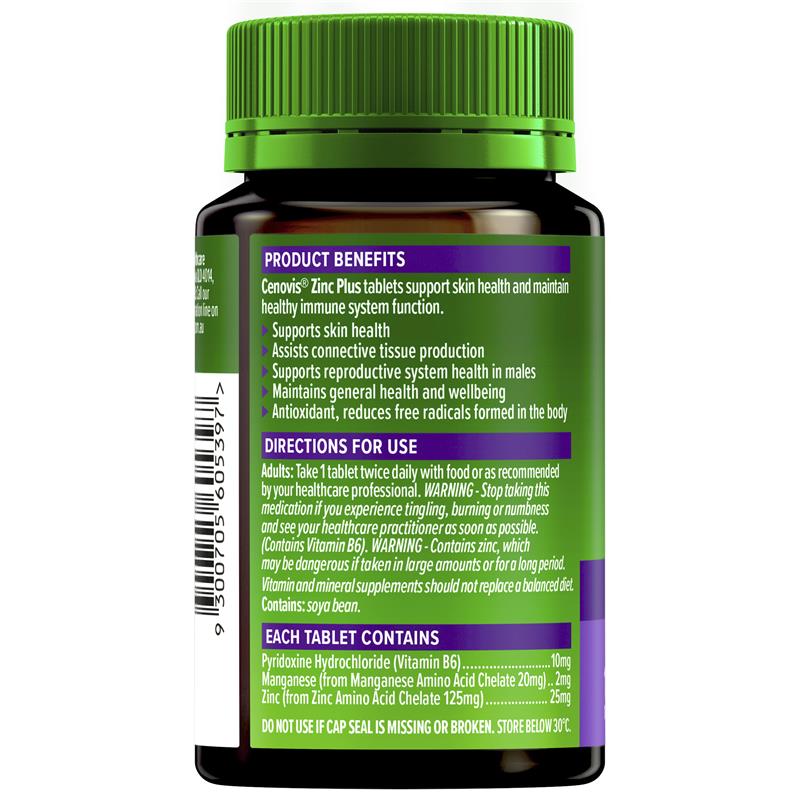 Cenovis Zinc Plus hỗ trợ chức năng hệ thống miễn dịch khỏe mạnh và duy trì sức khỏe và hạnh phúc nói chung. Nó hỗ trợ sức khỏe làn da và hỗ trợ sản xuất mô liên kết. Kẽm cũng hỗ trợ sức khỏe hệ thống sinh sản nam giới.