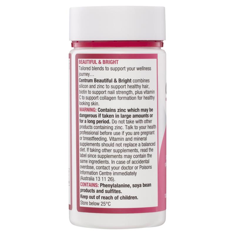 Cảm giác đẹp bắt đầu từ bên trong. Centrum Beautiful & Bright cung cấp các chất dinh dưỡng giúp bạn tỏa sáng, kết hợp silicon và kẽm để hỗ trợ tóc khỏe mạnh và biotin để hỗ trợ móng chắc khỏe, cùng với vitamin C để hỗ trợ hình thành collagen cho làn da khỏe mạnh.