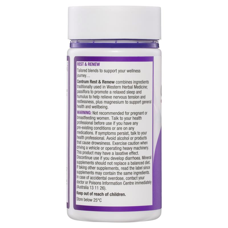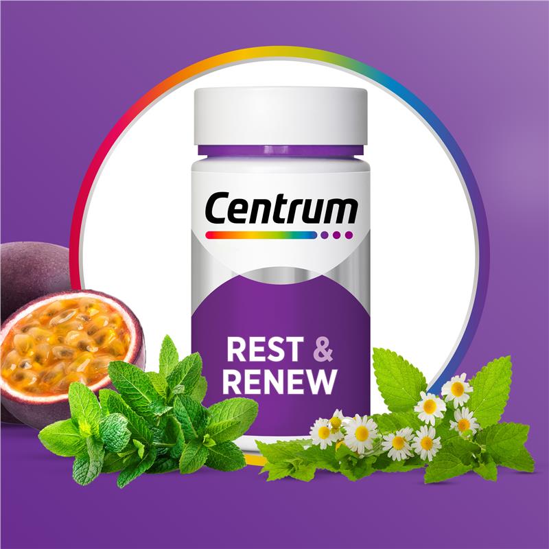 Cảm thấy thư giãn và tràn đầy năng lượng. Centrum Rest & Renew kết hợp các thành phần hoa lạc tiên, theo truyền thống được sử dụng trong y học thảo dược phương Tây để thúc đẩy giấc ngủ thư giãn và humulus, theo truyền thống được sử dụng trong Y học thảo dược phương Tây để giúp làm giảm căng thẳng thần kinh và bồn chồn, cũng như magiê để hỗ trợ sức khỏe và tinh thần nói chung.