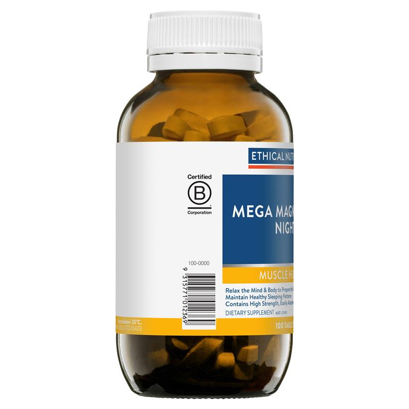Viên uống ban đêm Ethical Nutrients Mega Magnesium thúc đẩy giấc ngủ ngon và thư giãn, kết hợp magiê và lạc tiên trong công thức dùng ban đêm.