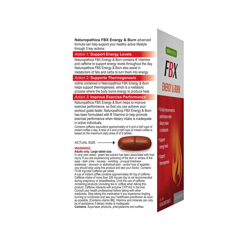 Naturopathica FBX Energy & Burn chứa Vitamin B và caffeine để hỗ trợ mức năng lượng trong suốt cả ngày. Naturopathica FBX Energy & Burn cũng có thể hỗ trợ quá trình chuyển hóa chất béo và carbohydrate để biến chúng thành năng lượng.