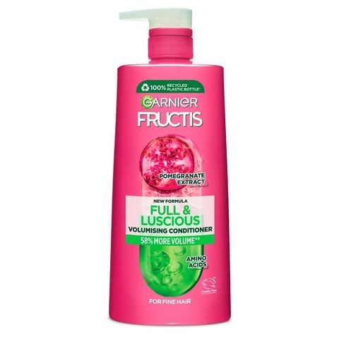 Dầu xả Garnier Fructis Full & Luscious kết hợp chiết xuất từ quả lựu tự nhiên với phân tử đột phá, làm đầy sợi tóc, thấm sâu vào sợi tóc và sau đó nở ra, tạo độ dày lâu dài với lớp hoàn thiện nhẹ như không. KẾT QUẢ: Tóc dày hơn*, đầy đặn hơn, khỏe mạnh hơn và chắc khỏe hơn. *Kiểm tra thực tế: gội đầu + xả sau 5 lần sử dụng. Tất cả các sản phẩm của Garnier đều được Cruelty Free International chính thức chấp thuận. Từ năm 1989, Garnier đã cam kết vì một thế giới không thử nghiệm trên động vật.Kích thước: 850ml
