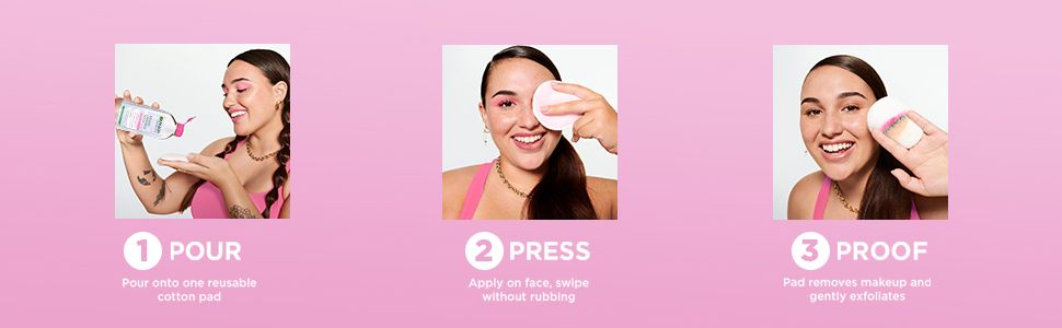 Thấm sản phẩm vào miếng bông và lau sạch mặt, vùng mắt và môi. Không cần rửa lại.