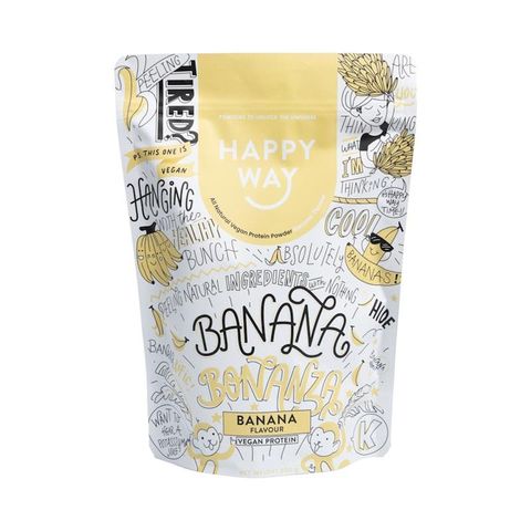 Hương vị trái cây và tuyệt vời, Bột protein thuần chay Happy Way Banana Bonanza của chúng tôi chứa đầy chất dinh dưỡng và là một cách tuyệt vời để biến sinh tố chuối tự làm của bạn thành một chất tăng cường năng lượng giàu dinh dưỡng! Mịn, béo ngậy và chứa đầy các thành phần hữu cơ, lành mạnh, đây là hương vị mà cả gia đình sẽ yêu thích trong mọi thứ, từ đồ ăn nhẹ và món tráng miệng tự làm đến sinh tố và sữa lắc hàng ngày. Thành phần Hỗn hợp protein thực vật (80%) (Protein đậu vàng hữu cơ, Protein gạo lứt hữu cơ), Hương vị tự nhiên, Chất xơ rễ rau diếp xoăn, Bột dừa (Chứa Triglyceride chuỗi trung bình, Kẹo cao su Acacia), Bột Maca hữu cơ, Hạt chia hữu cơ, Vỏ hạt mã đề, Kẹo cao su Guar, Muối hồng Himalaya, Chất tạo ngọt (Steviol Glycoside, Thaumatin), Riboflavin. Chất gây dị ứng có thể chứa các loại hạt cây, Trứng, Hạt vừng. Chứa đậu nành Hướng dẫn sử dụng Lắc 30 gram trong lọ hoặc bình lắc với 250ml nước, sữa hoặc sữa hạt. Ngoài ra, bạn có thể trộn 30 gram vào yến mạch, sữa chua tự nhiên hoặc sinh tố của mình. Để có kết quả tối ưu, hãy dùng hai lần một ngày. Hướng dẫn bảo quản Bảo quản dưới 30°C, tránh ánh nắng trực tiếp. Cảnh báo Sản phẩm này là thực phẩm bổ sung thể thao được pha chế và không phải là nguồn dinh dưỡng duy nhất. Nên dùng kết hợp với chế độ ăn uống lành mạnh, đa dạng, lối sống năng động và chương trình tập luyện phù hợp. Không phù hợp với trẻ em dưới 15 tuổi hoặc phụ nữ có thai. Chỉ nên sử dụng dưới sự giám sát của bác sĩ hoặc chuyên gia dinh dưỡng. Vui lòng tham khảo bao bì sản phẩm.