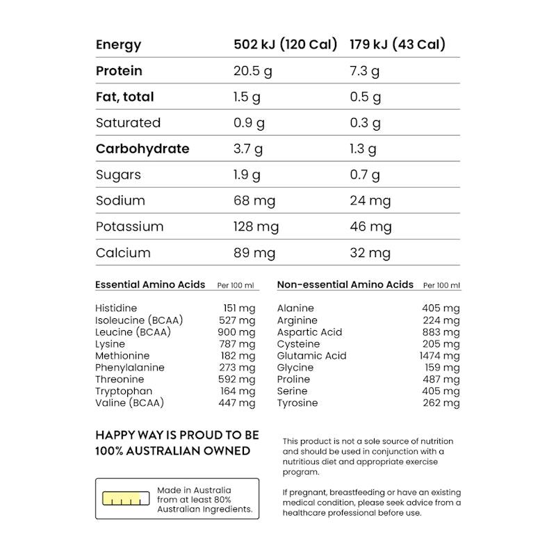 Ngọt ngào, vàng ươm và cực kỳ ngon! Bột Protein Whey Mật ong Manuka Phiên bản giới hạn mới của Happy Way đã có mặt để rắc thêm chút ngọt ngào vào ngày của bạn. Hoàn hảo để tiếp thêm năng lượng sau khi tập luyện hoặc như một món ăn nhẹ lành mạnh và no bụng, hương vị này chính là tấm vé vàng cho một bữa ăn ngon, bổ dưỡng. Nhưng đừng chần chừ quá lâu - hương vị Phiên bản giới hạn này vừa thoáng qua vừa ngọt ngào! Whey Protein Concentrate 84% [Whey (Sữa), Lecithin Hoa hướng dương], Bột Sữa Gầy, Bột Mật ong Manuka Sấy Đông Lạnh (5%), Hương vị Tự nhiên, Bột Dừa (Chứa Triglyceride Chuỗi Trung bình, Kẹo cao su Acacia), Bột Maca, Hạt Chia Hữu cơ, Vỏ Hạt Mã Đề, Chất Tạo Ngọt (Steviol Glycoside, Thaumatin), Muối Đá Himalaya. Chất gây dị ứng có thể chứa các loại hạt cây, Trứng, Hạt vừng. Chứa Đậu nành, Sữa Hướng dẫn sử dụng Lắc 30 gam trong lọ hoặc bình lắc với 250ml nước, sữa hoặc sữa hạt. Ngoài ra, bạn có thể trộn 30 gram vào yến mạch, sữa chua tự nhiên hoặc sinh tố. Để có kết quả tối ưu, hãy dùng hai lần một ngày. Hướng dẫn bảo quản Bảo quản dưới 30°C, tránh ánh nắng trực tiếp. Cảnh báo Sản phẩm này là thực phẩm bổ sung thể thao được pha chế và không phải là nguồn dinh dưỡng duy nhất. Nên dùng kết hợp với chế độ ăn uống lành mạnh, đa dạng, lối sống năng động và chương trình tập luyện phù hợp. Không phù hợp với trẻ em dưới 15 tuổi hoặc phụ nữ mang thai. Chỉ nên sử dụng dưới sự giám sát của bác sĩ hoặc chuyên gia dinh dưỡng. Vui lòng tham khảo bao bì sản phẩm.