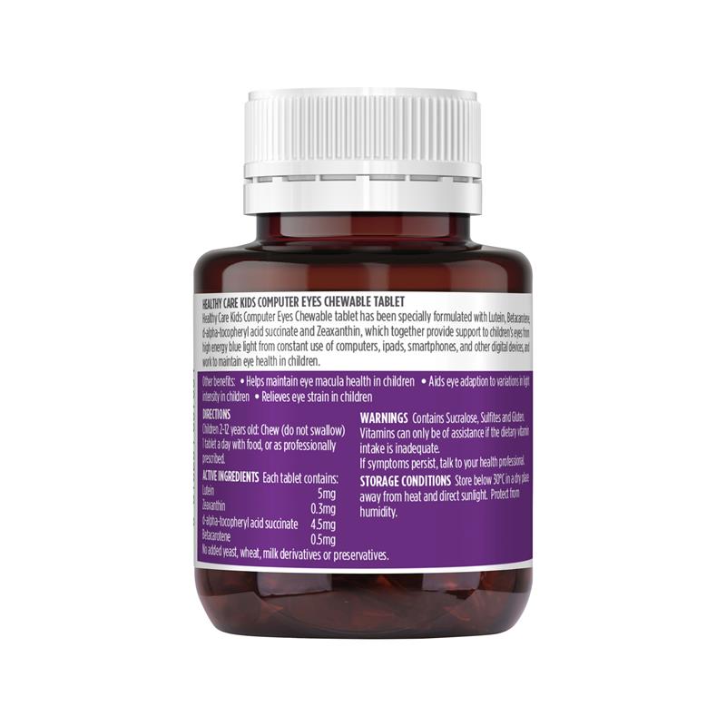 Viên nhai Kids Computer Eyes của Healthy Care được bào chế đặc biệt với Lutein, giúp hỗ trợ mắt trẻ em khỏi ánh sáng xanh năng lượng cao từ việc sử dụng máy tính, ipad, điện thoại thông minh và các thiết bị kỹ thuật số khác liên tục, đồng thời giúp duy trì sức khỏe mắt ở trẻ em.Phù hợp với: Trẻ em từ 2 tuổi trở lên