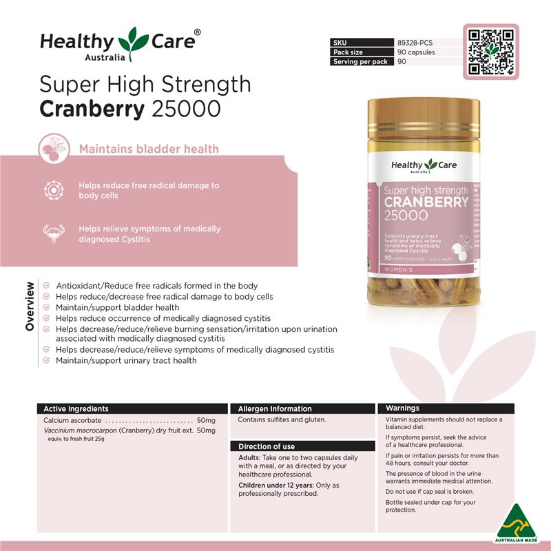 Tuyên bố về sản phẩm: Super High Strength Cranberry 25000 của Healthy Care được bào chế đặc biệt với liều lượng chiết xuất nam việt quất mạnh giúp hỗ trợ sức khỏe đường tiết niệu và làm giảm tình trạng viêm bàng quang được chẩn đoán về mặt y khoa.
