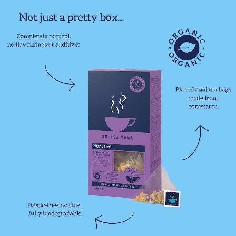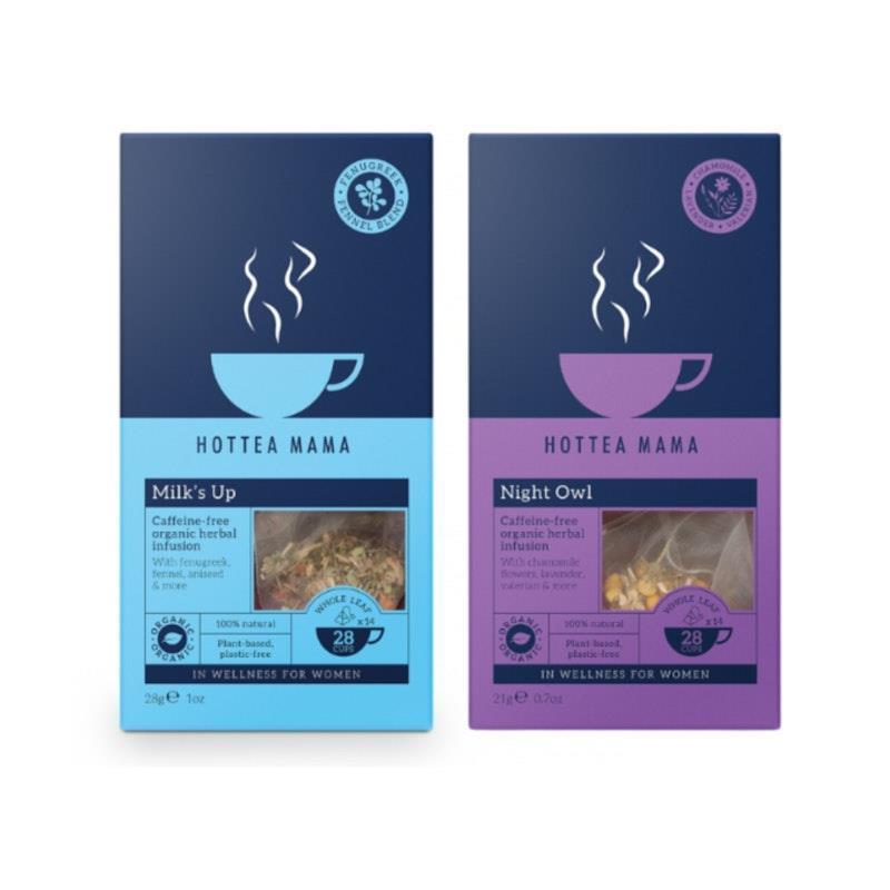 Milk's Up - Hương thảo, hạt thì là, hồi, cỏ roi ngựa chanh, lá tầm ma, hạt cỏ cà ri. Tất cả các thành phần hữu cơ được chứng nhận. Night Owl - Cúc La Mã, rooibos, rễ cây nữ lang, hoa chanh, hoa oải hương, hoa thanh cúc. Tất cả các thành phần hữu cơ được chứng nhận.