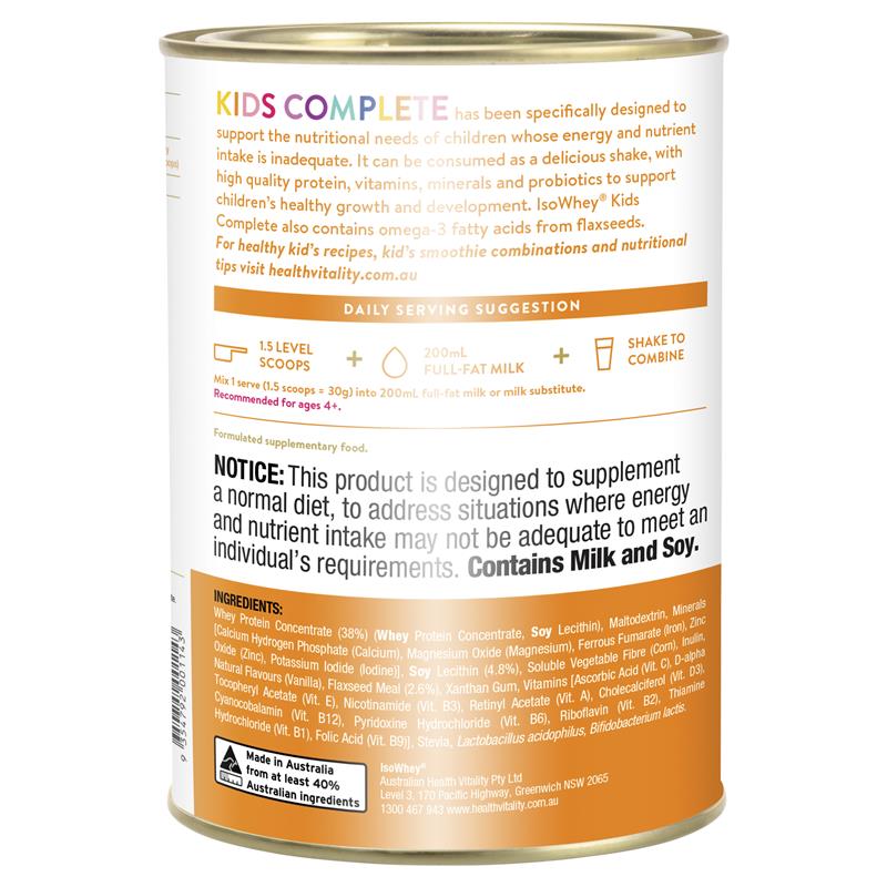 IsoWhey Kids Complete được thiết kế đặc biệt để hỗ trợ nhu cầu dinh dưỡng của trẻ em có lượng năng lượng và chất dinh dưỡng không đủ.Có thể dùng như một loại sữa lắc ngon, với protein chất lượng cao, vitamin, khoáng chất và men vi sinh để hỗ trợ sự phát triển và tăng trưởng khỏe mạnh của trẻ. IsoWhey® Clinical Nutrition Kids Complete cũng chứa axit béo omega-3 từ hạt lanh.