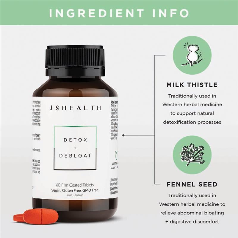 Chứa: Công thức JSHealth Detox + Debloat có chứa cây kế sữa, hạt thì là và nghệ. Công thức thuần chay.