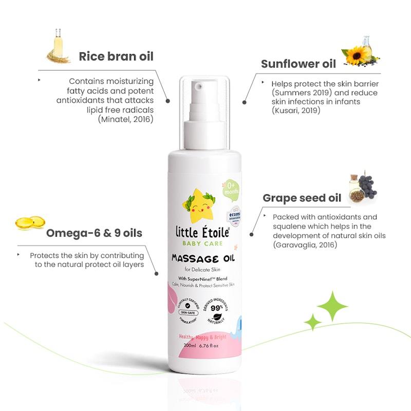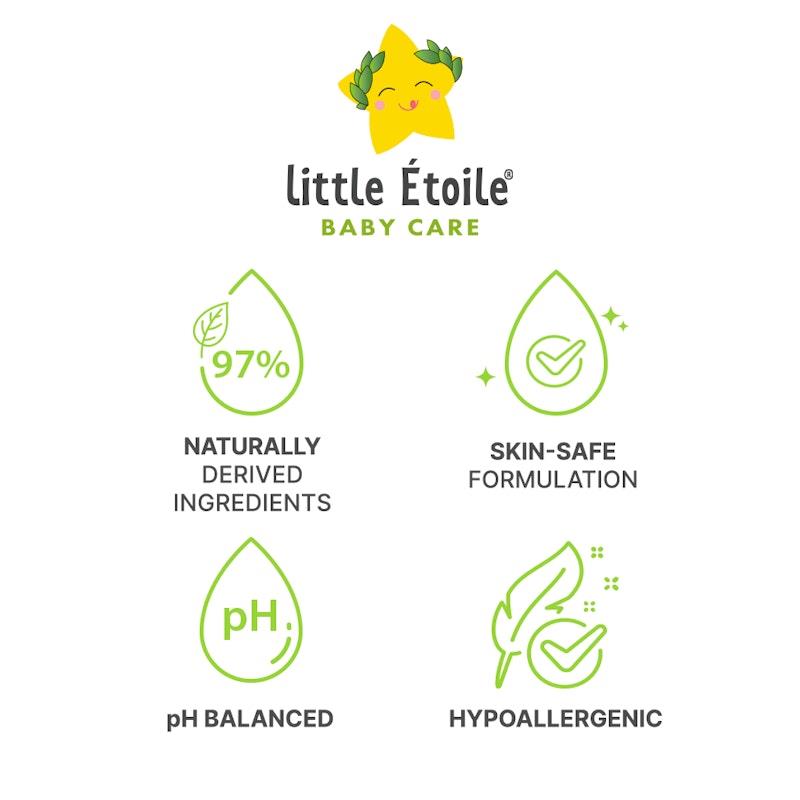 Trẻ sơ sinh phản ứng với sự chạm và khứu giác ngay khi chào đời, thậm chí trước khi chúng có thể nhìn và nghe bình thường. Gắn kết với con bạn bằng DẦU MASSAGE Little Étoile® Baby Care thơm mát và dịu nhẹ dành cho làn da mỏng manh (0+ tháng) như một phần trong thói quen hàng ngày của bạn. Với hỗn hợp SuperNine! hoàn toàn từ thực vật của chúng tôi , được chế tạo cẩn thận với 9 loại dầu được lựa chọn đặc biệt có thể giúp làm dịu bé và thúc đẩy giấc ngủ ngon, đồng thời nhẹ nhàng dưỡng ẩm cho da khô và phục hồi vẻ rạng rỡ tự nhiên của bé. Nhìn vào mắt bé và cảm nhận tình yêu thương với loại dầu massage trái cây tươi mát này.