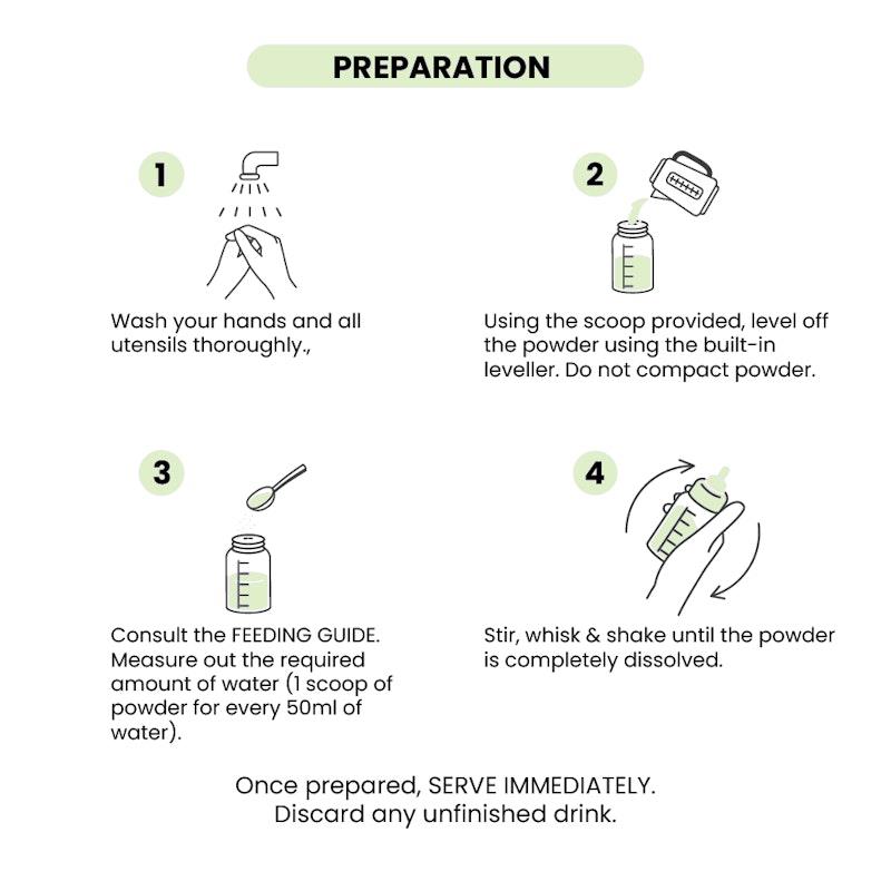 * 1 muỗng bột pha với 60mL nước sẽ cho ra khoảng 66mL sữa công thức. Sữa công thức nên được pha ngay trước khi cho ăn hoặc bảo quản lạnh để sử dụng trong vòng 24 giờ. Chỉ sử dụng muỗng kèm theo. LƯU Ý: Đây chỉ là khuyến nghị, vì lượng sữa thực tế sẽ phụ thuộc vào nhu cầu của bé.