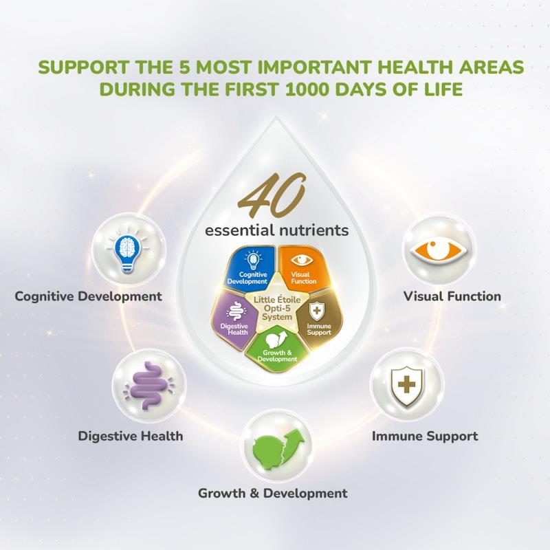 • Được thiết kế để hỗ trợ phát triển nhận thức, chức năng hệ thống miễn dịch và tăng trưởng & phát triển khỏe mạnh bình thường.