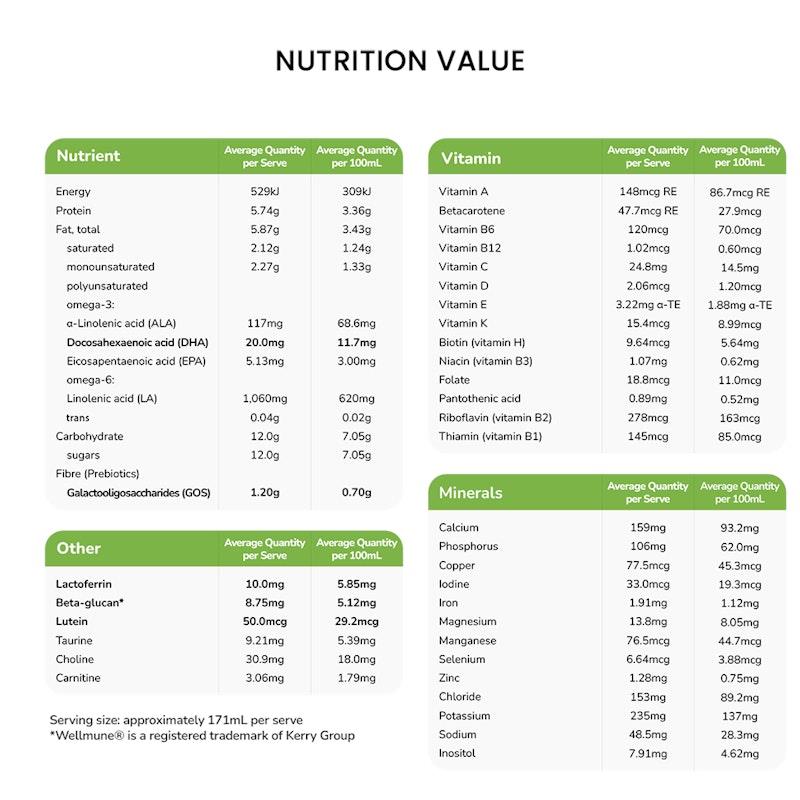 • Được bào chế khoa học với Lactoferrin từ Úc, Wellmune Beta-Glucan, GOS, DHA & EPA, Lutein và 34 chất dinh dưỡng thiết yếu khác để bổ sung nhu cầu dinh dưỡng bình thường của trẻ mới biết đi.