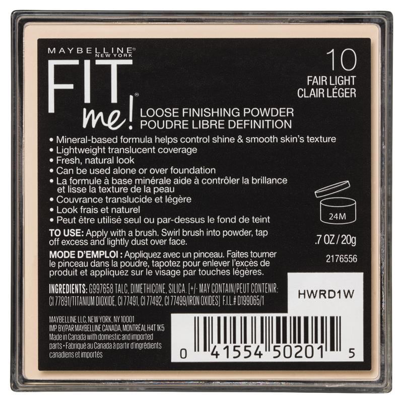 Công thức nhẹ mượt này giúp kiểm soát độ bóng và làm mịn kết cấu da với một chút màu sắc. Phấn phủ dạng bột Maybelline Fit Me Loose Finishing Powder mang đến lớp hoàn thiện hoàn hảo cho lớp nền trang điểm của bạn.Kích thước: 20g