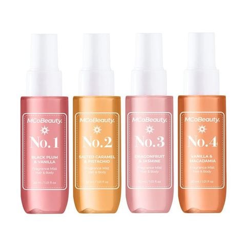 MCoBeauty ESSENTIAL FRAGRANCE MIST COLLECTION là bộ 4 sản phẩm hương thơm sống động và quyến rũ, hoàn thiện mọi phong cách, ngày hay đêm. Một bộ sản phẩm không thể thiếu cho bất kỳ ai muốn khám phá phạm vi hoặc lớp hương để tạo nên sự pha trộn tùy chỉnh. Kích thước hoàn hảo để mang theo bên mình mọi lúc, mọi nơi. Mùi hương yêu thích của bạn sẽ luôn trong tầm tay! SỐ 1 BLACK PLUM & VANILLA Một hương thơm trái cây tinh khiết, nồng nàn với hương hoa ấm áp, được hỗ trợ bởi Mận, Vani và Xạ hương. SỐ 2 SALTED CARAMEN & PISTACHIO Một hương thơm quyến rũ và gợi cảm, được tăng cường bởi hương ấm áp của Pistachio và Gỗ đàn hương, phủ lên trên là Caramel và Vani. SỐ 3 DRAGON FRUIT & JASMINE Một hương thơm lấp lánh và tươi sáng với sự bùng nổ tràn đầy năng lượng của các loại trái cây hấp dẫn, được tăng cường với hương hoa ngọt ngào, tinh chất nhiệt đới và vải thiều. SỐ 3 4 VANILLA & MACADAMIA Giống như một chiếc bánh quy mới nướng, với hương caramel cháy và hạt macadamia nướng, rưới thêm sô cô la trắng và muối biển.