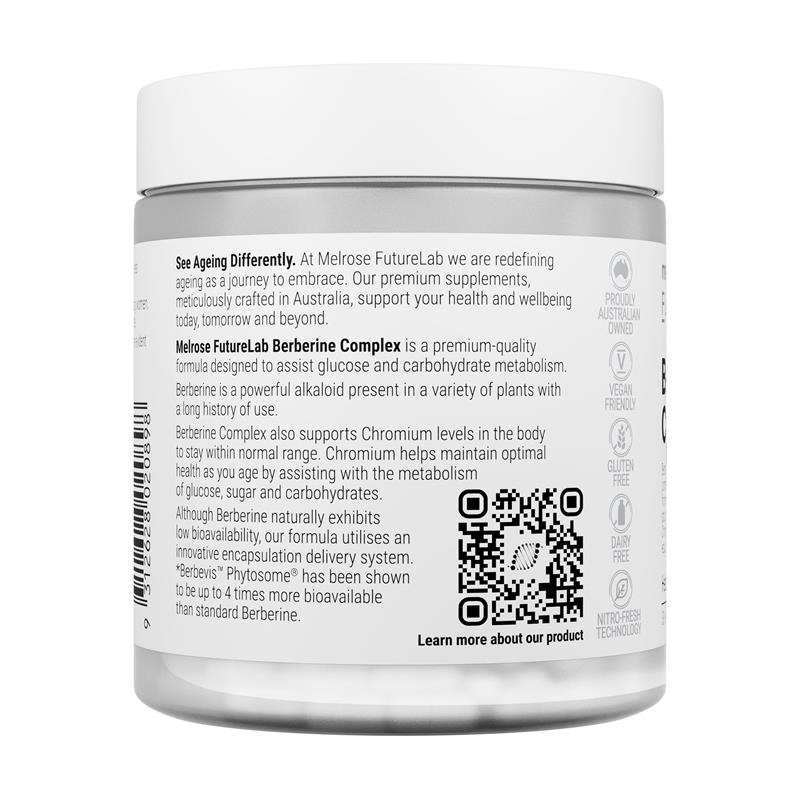 Công thức cao cấp Melrose FutureLab Berberine Complex được thiết kế để hỗ trợ quá trình chuyển hóa glucose và carbohydrate và giúp duy trì cân nặng cơ thể khỏe mạnh. Berberine là một ancaloit mạnh có trong nhiều loại thực vật như nho và nghệ. Berberine Complex cũng hỗ trợ mức Crom trong cơ thể duy trì ở mức bình thường. Crom giúp duy trì sức khỏe tối ưu