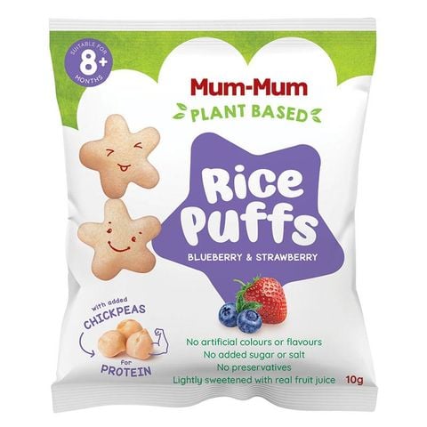 Mum Mum Plant Based Rice puffs có hình ngôi sao tiện lợi để dễ dàng cầm nắm và thêm chút thú vị. Không chứa màu hoặc hương vị nhân tạo, không thêm đường hoặc muối, không chất bảo quản và được làm ngọt nhẹ bằng nước ép trái cây thật. Ngoài ra, còn có thêm đậu gà để cung cấp protein giúp tăng trưởng khỏe mạnh và phát triển cơ bắp.
