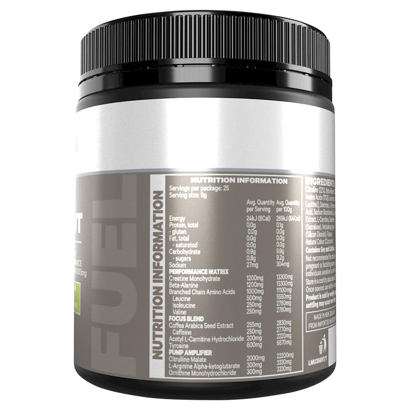 Citrulline (22%), Beta Alanine (13%), Creatine (13%), Axit amin chuỗi nhánh hòa tan (11%) [Leucine, Isoleucine, Valine, Chất nhũ hóa (Lecithin đậu nành)], Dextrose, L-Tyrosine, Chất điều chỉnh độ axit (Axit malic, Axit citric, Natri bicarbonate), L-Arginine, L-Ornithine, Chiết xuất hạt cà phê, L-Carnitine, Chất tạo ngọt (Sucralose), Chất chống vón cục (Silicon Dioxide), Hương vị, Màu tự nhiên (Curcumin)