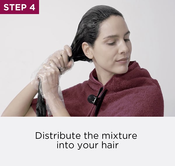 Để thực hiện, hãy rẽ một đường bằng đầu chai xịt và thoa đều hỗn hợp dọc theo đường rẽ vào chân tóc bằng đầu ngón tay (vẫn đeo găng tay đi kèm). Lặp lại quy trình này cho toàn bộ vùng tóc mọc lại.