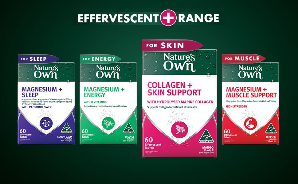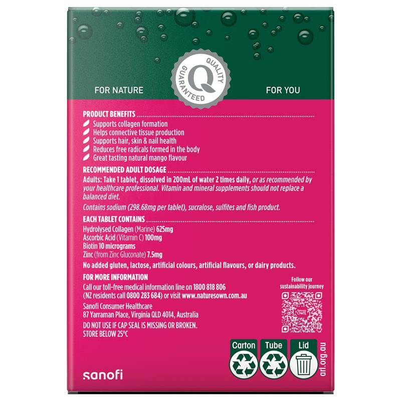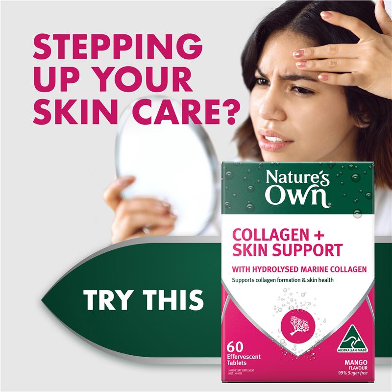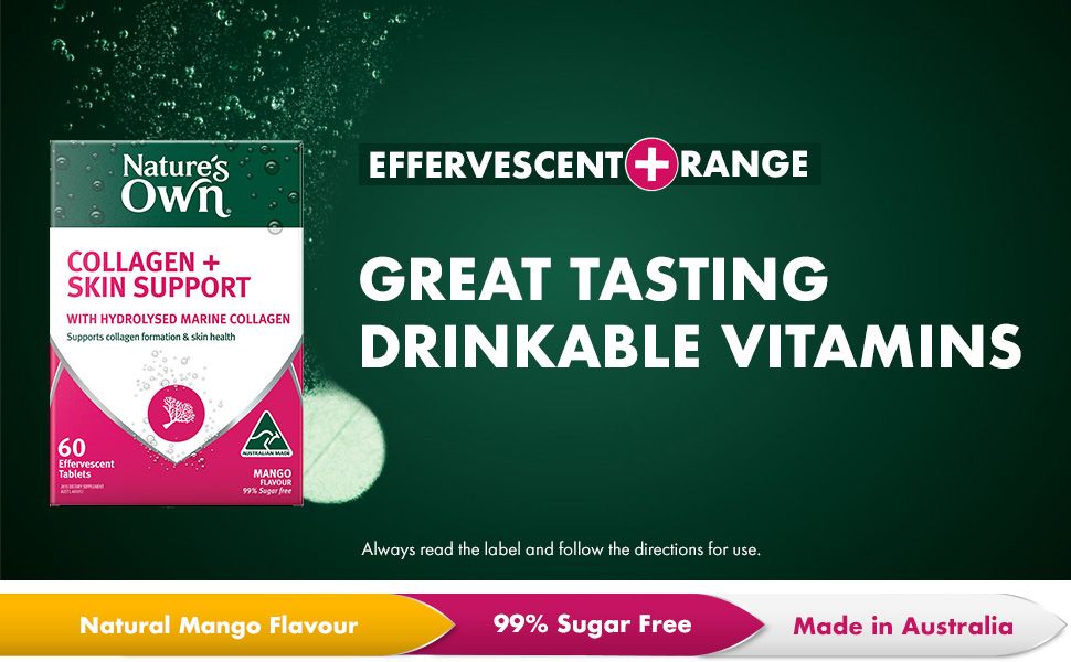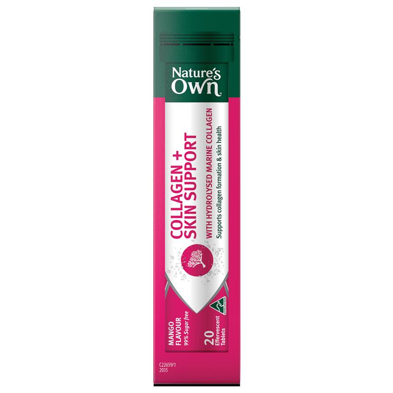 Hỗ trợ hình thành collagen trong cơ thể và duy trì sức khỏe làn da của bạn với Viên uống hỗ trợ da Collagen + Skin Support 60 viên của Nature's Own. Công thức hỗ trợ da collagen dễ uống của chúng tôi hòa tan dễ dàng trong nước để tạo thành thức uống có ga hương xoài có hương vị tuyệt vời. Mỗi viên cung cấp collagen biển thủy phân (625mg), Vitamin C (100mg), Biotin (10mcg) và Kẽm (7,5mg). Collagen rất quan trọng cho quá trình hình thành và sản xuất mô liên kết, giúp duy trì làn da, mái tóc và móng khỏe mạnh. Ngoài ra, viên uống hỗ trợ da Collagen + Skin Support của Nature's Own còn làm giảm các gốc tự do trong cơ thể. Người lớn, uống 1 viên, hòa tan trong 200ml nước hai lần mỗi ngày hoặc theo khuyến nghị của chuyên gia chăm sóc sức khỏe của bạn. Luôn đọc nhãn và làm theo hướng dẫn sử dụng. Được sản xuất tại Úc® và được thử nghiệm nghiêm ngặt để đảm bảo chất lượng, hiệu lực và độ tinh khiết, Viên uống hỗ trợ da Collagen + Skin Support của Nature's Own không chứa 99% đường và không chứa gluten, lactose, màu nhân tạo, hương vị nhân tạo hoặc các sản phẩm từ sữa*.*Có chứa natri, sucralose, sulfite, sản phẩm từ cá