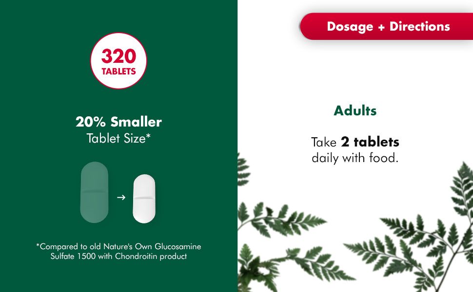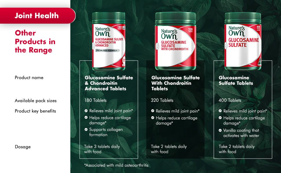 Để làm giảm các triệu chứng của bệnh viêm xương khớp nhẹ như giảm tổn thương sụn và giảm đau khớp nhẹ, hãy thử Viên nén Glucosamine Sulfate & Chondroitin 320 viên của Nature's Own. Glucosamine là một trong những thành phần chính cấu tạo nên sụn và dịch hoạt dịch, đóng vai trò trong sức mạnh và độ đàn hồi của khớp. Nature's Own Glucosamine Sulfate & Chondroitin giúp duy trì khả năng vận động của khớp và làm dịu cơn đau khớp nhẹ và tình trạng cứng khớp liên quan đến bệnh viêm xương khớp nhẹ. Được sản xuất tại Úc® và được kiểm tra nghiêm ngặt để đảm bảo chất lượng, hiệu lực và độ tinh khiết, Nature's Own Glucosamine Sulfate & Chondroitin không chứa gluten, lactose, đường, màu hoặc hương vị nhân tạo, chất tạo ngọt hoặc chất bảo quản nhân tạo, các sản phẩm từ sữa hoặc thành phần có nguồn gốc từ động vật*. Người lớn, uống 2 viên mỗi ngày cùng thức ăn hoặc theo khuyến nghị của chuyên gia chăm sóc sức khỏe. Luôn đọc nhãn và làm theo hướng dẫn sử dụng. Nếu các triệu chứng vẫn tiếp diễn, hãy tham khảo ý kiến chuyên gia chăm sóc sức khỏe của bạn.*Liều dùng hàng ngày được khuyến cáo của thuốc này chứa 161mg natri. Chứa các sản phẩm từ động vật giáp xác và sulfit.